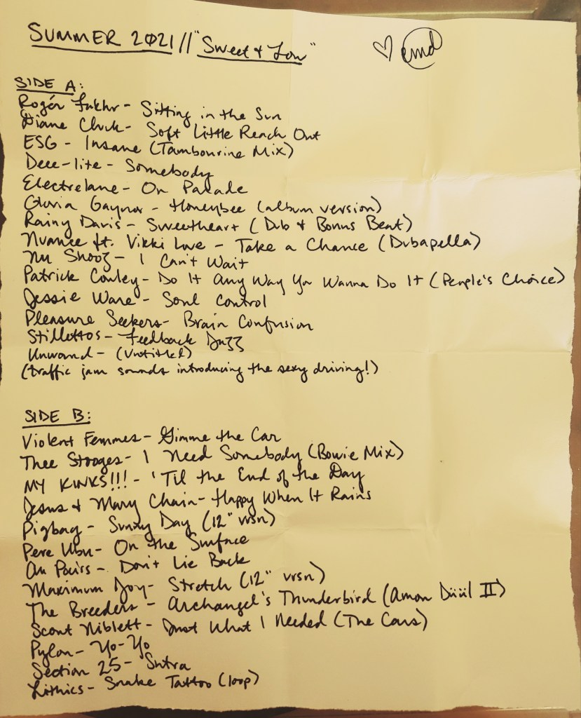 I thought about shelving this tape and just making a new summer mixtape, since I made this one for someone who did not deserve it (again), and because there was still summer left to have a new sonic thesis about. But the more I thought about it, the creation of this tape was actually an outgrowth of my own process of figuring out what love is to me and what kind of relationship I want to be in: how it feels, what it expresses, all of the colors and shapes and sounds and multitudes it contains, for me. It was an outgrowth of setting boundaries with people, leaving situations that did not align with my needs and desires, and really getting to the bottom of who I am, what I want, and being fucking insistent about it. It is the final outcome of two decades of trying to have healthy and fulfilling relationships without models or guides and with an enormous amount of trauma interrupting and confusing it every step of the way. It has also been exactly seven years since the person I was very in love with died suddenly, so every cell in my body has officially regenerated itself, and I finally feel ready for the kind of Really Big Love that I am actually all about at my core again. And out of all of this, we arrive at SWEET AND LOW–my “sweetheart set.” ❤