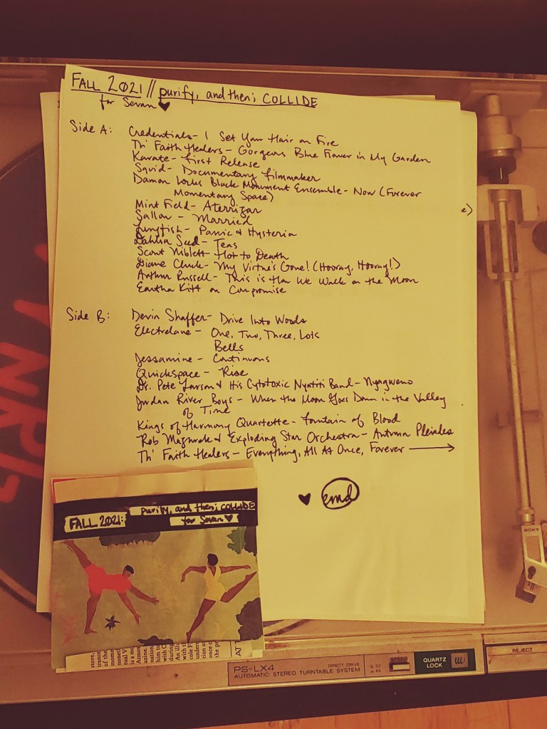 I have come to appreciate little mistakes in making tapes for people and to find that they often unintentionally improve the meaning or add to the feeling of what I am doing–on this tape, the needle goes backwards for a second during the Jessamine song, and it honestly feels perfectly suited to the meaning of the song, there are little blips and blurps which prove this is a thing I actually made with my hands for someone I love, there are moments where the treble is a little too high for something and you hear me turn it down before it gets out of control, like you’re sitting on my couch by the pure fire of the pure tubes. I love that in so many of these songs, I was able to record them from my records, and because they are songs I love very much and have listened to often since the era of my life in which I first came to know Sevan, the pops and hisses are off the chain (Scout Niblett, Electrelane). You can hear the history between songs and people.