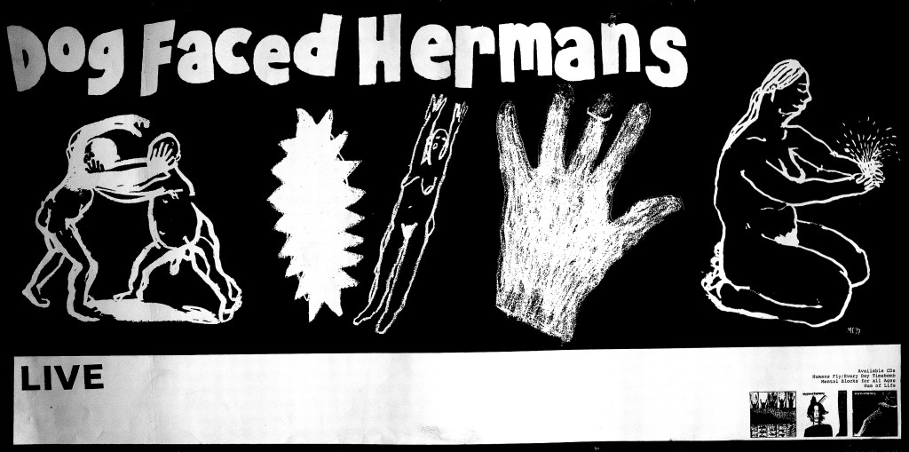 This mixtape exists to tell the story of Dog Faced Hermans–from the song that inspired their first band, Volunteer Slavery, to the bands they influenced in the United States at the turn of the century. I selected an equal amount of tracks from lists submitted to me by Moor and Plum, one tune they both asked for, and I added the “Volunteer Slavery” intro for narrative effect and selected all of the DFH tracks and the songs from Erase Errata and Black Eyes, bands that were important to me growing up in the aughts that were heavily influenced by the Hermans. While my programming of the tracks is certainly part of the success of this mix, the incredible tunes suggested by Moor and Plum are really its greatest wealth–it’s difficult to not deeply enjoy listening to these tunes, probably in whatever order they occur!