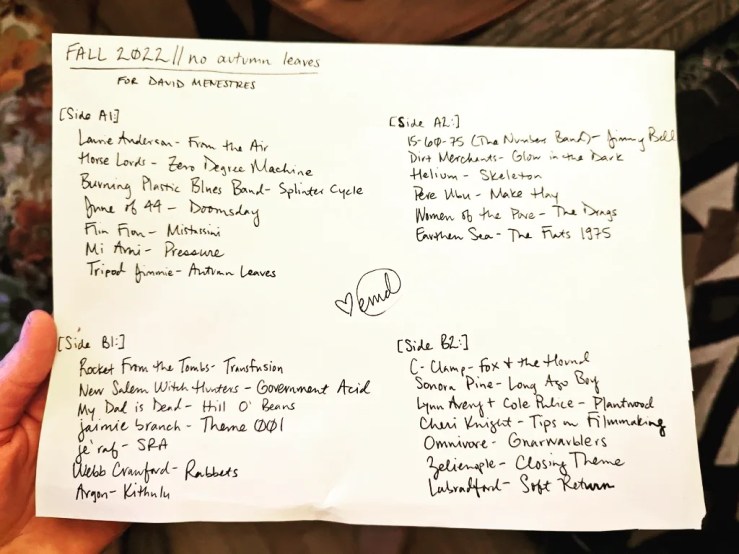 On the last side, I’m searching, chasing…the past and the future are starting to collide in the present moment. Old releases from C-Clamp and Sonora Pine get new life via well-deserved reissues, and I’m a part of it, I wrote about these people this year! It’s all a part of the story that’s constantly unfolding. More My Dad is Dead reissues coming soon, and I’m a part of that, too. We slow down and remember how beautiful and strange it is to be alive at all. We get some “Tips on Filmmaking;” we set the stage for a new, ambitious work. We return to the recent past, Omnivore, who was the framework for my summer mixtape and has a great little a capella song about the mythical “Gnarwarblers,” whose call can be heard from mid-to-late fall, struggling to express experience or locate meaning…doing it anyway. It doesn’t always sound beautiful, but Glenna Van Nostrand does recounting it. Zelienople–whose drummer I wrote about recently–lead the closing of this epic, and we make a “Soft Return” to the beginning of the kranky label, as well as to being calm and ready to keep rotating around the sun into whatever is next. My interview with kranky co-founder, Bruce Adams, about his new book was the last thing I had to complete to sit down to write one of my own, which is exactly the kind of figurative passing of the torch that I love. Cycle complete.