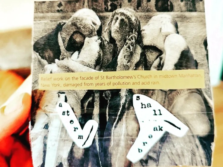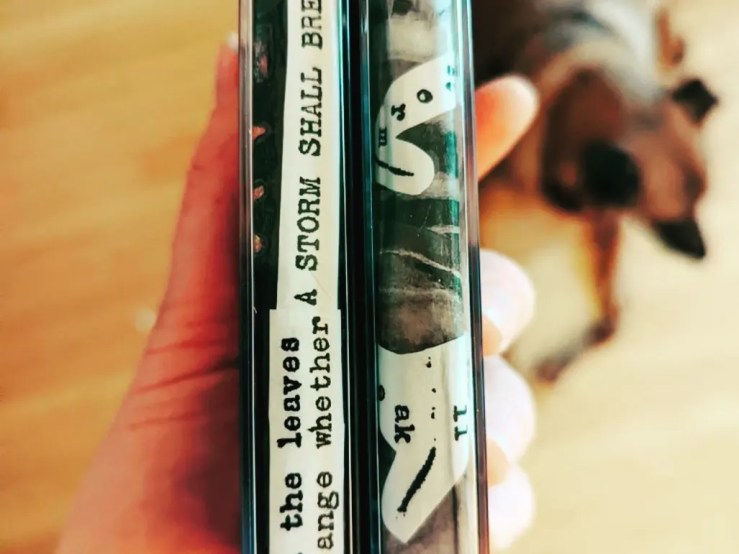 -He loves my dog, Lucy Parsons II, and specially requested the art to involve Lucy working with me on the tape. In figuring out how to do this, I discovered this webstore where you can have little prints of photos printed on nice 3×3 or 4×4 cardstock specifically. This is a boon, since I’m now buying my own huge stacks of high bias cassettes and individual cases–no more prepackaged tapes that come with a j-card and labels. Plus, I want to keep patronizing this shop that is catering so specifically to the dimensions of the j-card! I put the Lucy images on the inside of the covers, and used the blank side to make the art which would face out on either side. I used images from the same book about weather I have used in all of my mixtape art this year, made a huge graveyard of old Sharpies blacking out most of the main cover image, and I also cut up a print-out of the poem “A Storm Shall Break” by East Cleveland concrete poet, Russell Atkins. (David also loves concrete poetry.)