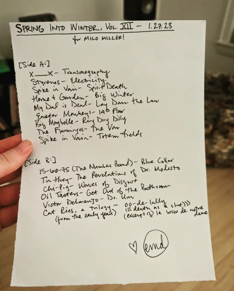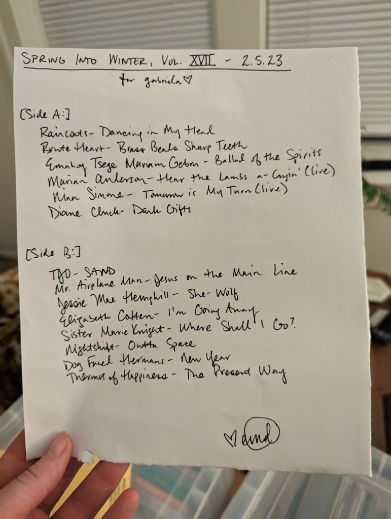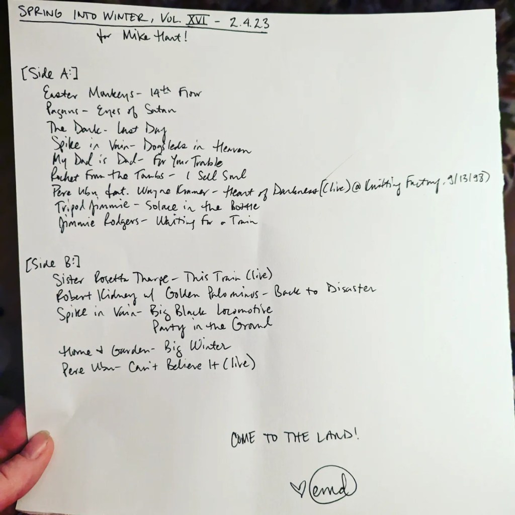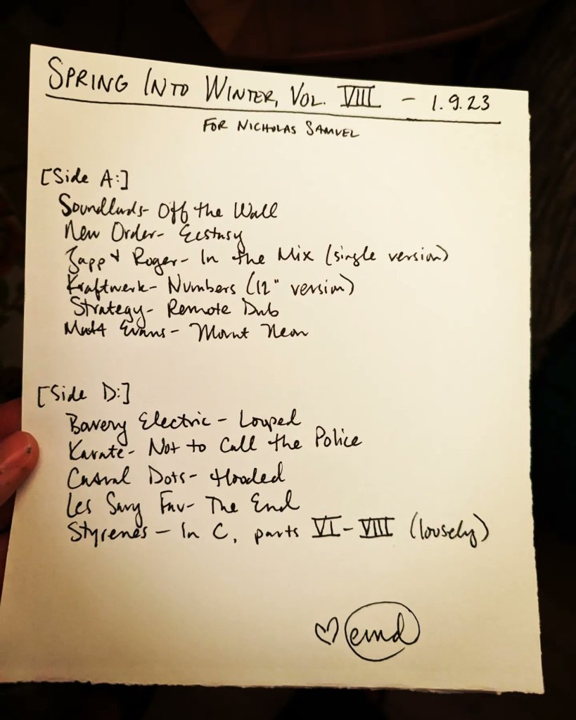 “Spring Into Winter” was a perfect title for an incredibly productive Mercury Retrograde Sanity Mixtape Series which yielded 17 one-off tapes for pals and TWO seasonal mixtapes: winter 2023//forces at work and spring 2023//this is the chariot!!!!! Now all this shit is going into a box until I return from the Black Eyes reunion Easter weekend and we’re in the shadow period of the next retrograde, in which I will be working towards my summer 2023 mixtape for Maria Barrios as a delighted returning resident of Cuyahoga County. This is the most mixtapes I have ever made for people during one of these and it was done during a period of time in which everything in my life has basically been on fire, so I am proud of it.