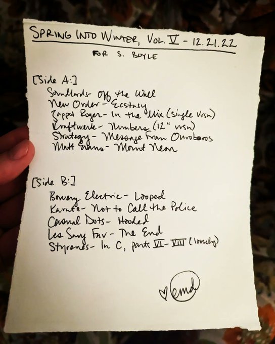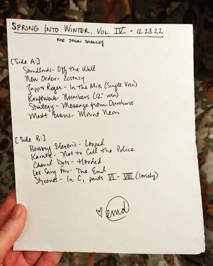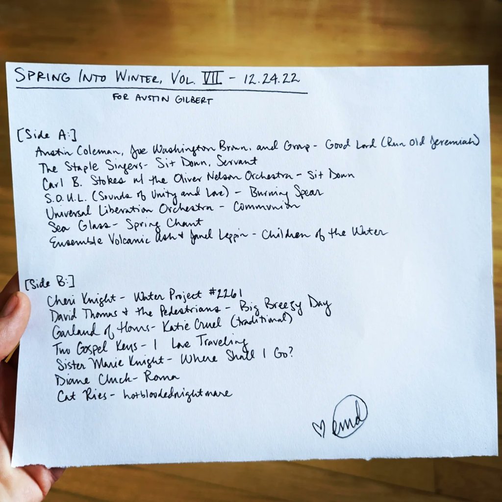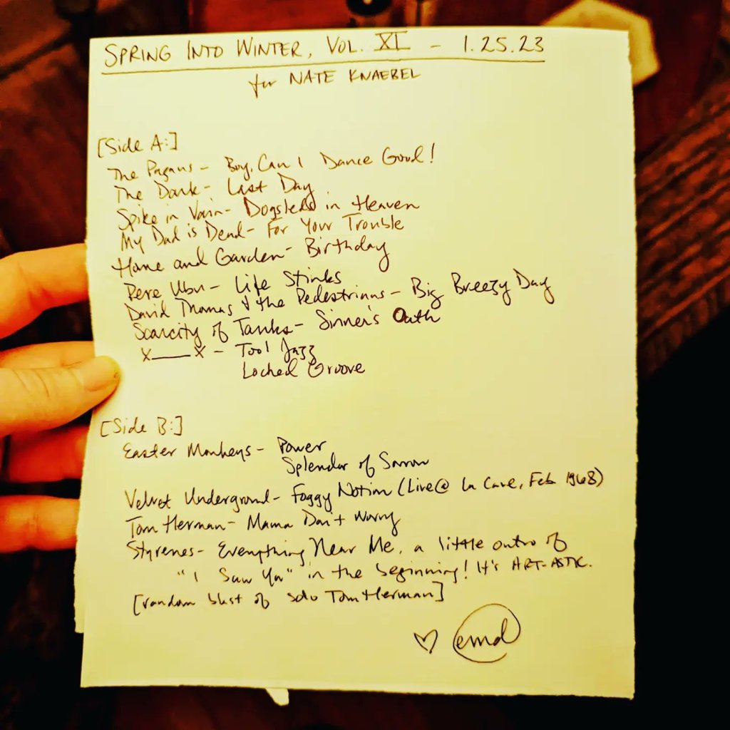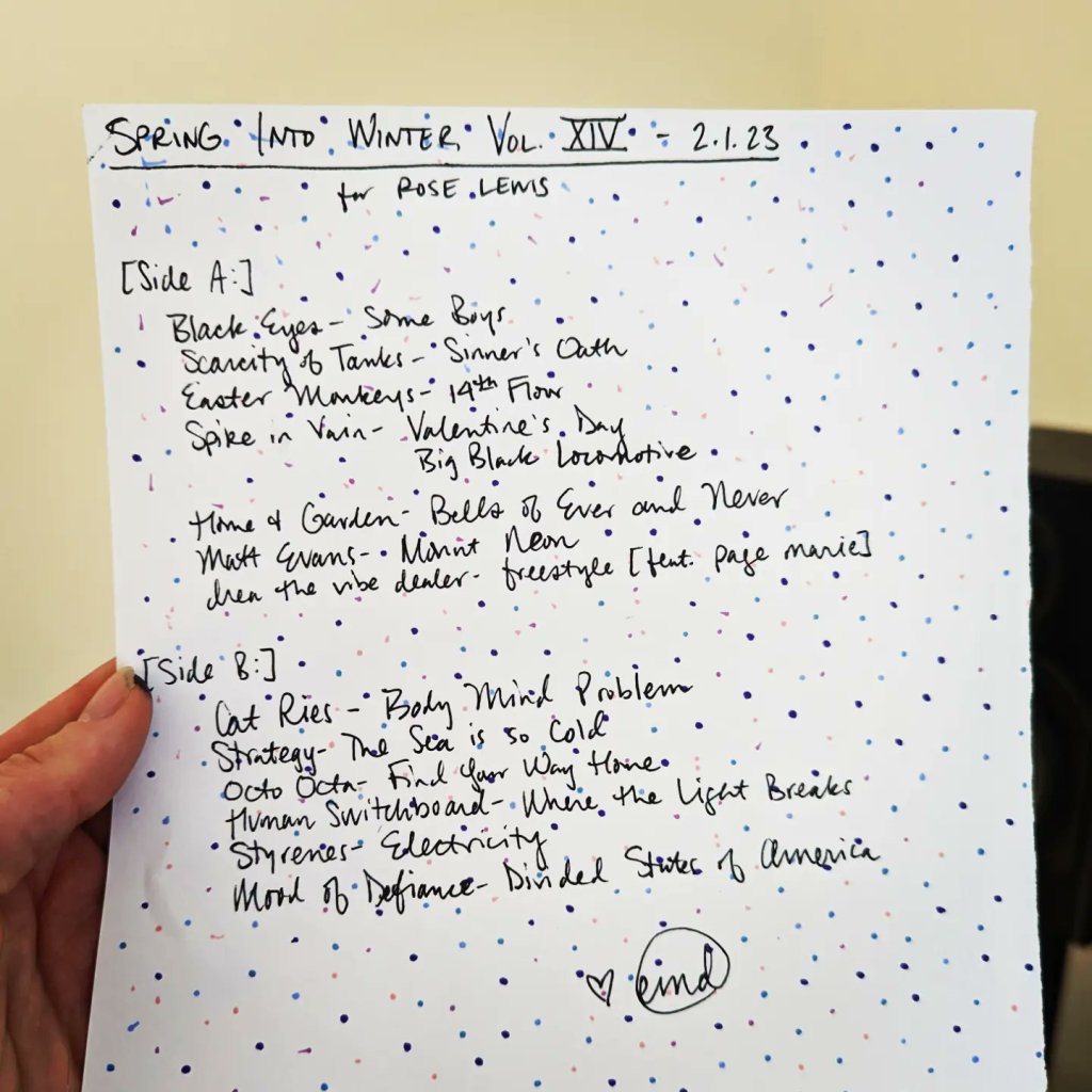 “Spring Into Winter” was a perfect title for an incredibly productive Mercury Retrograde Sanity Mixtape Series which yielded 17 one-off tapes for pals and TWO seasonal mixtapes: winter 2023//forces at work and spring 2023//this is the chariot!!!!! Now all this shit is going into a box until I return from the Black Eyes reunion Easter weekend and we’re in the shadow period of the next retrograde, in which I will be working towards my summer 2023 mixtape for Maria Barrios as a delighted returning resident of Cuyahoga County. This is the most mixtapes I have ever made for people during one of these and it was done during a period of time in which everything in my life has basically been on fire, so I am proud of it.