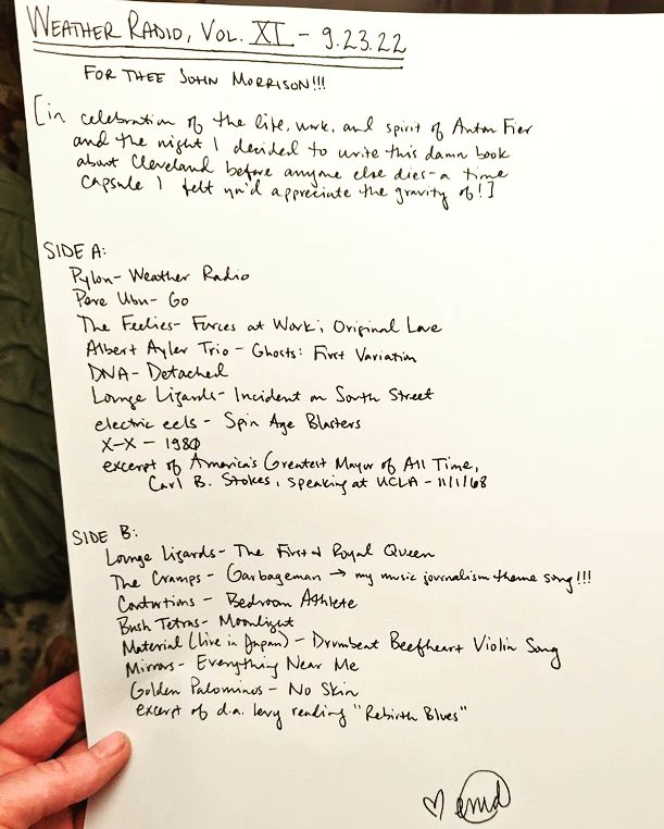 I wrote most of my winter 2023 mixtape in the days leading up to the road trip, sides A through C. Side D, I composed through the trip, on the road, singing these songs about going home and growing up into the total darkness of night and the fury of the snowstorm. It tells the story of my life from age 13 to 36—the age I was when I got into punk and came out about the abuse I’d experienced for most of my life up to that point and my family had to leave Cleveland during the criminal trial to the age I am now, writing the book the world needs on how my hometown modernized rock music. It’s a mixtape about this moment in which many threads of my life and my process of healing are coming together in this miraculous and powerful way and many things I never believed were possible are actually happening.