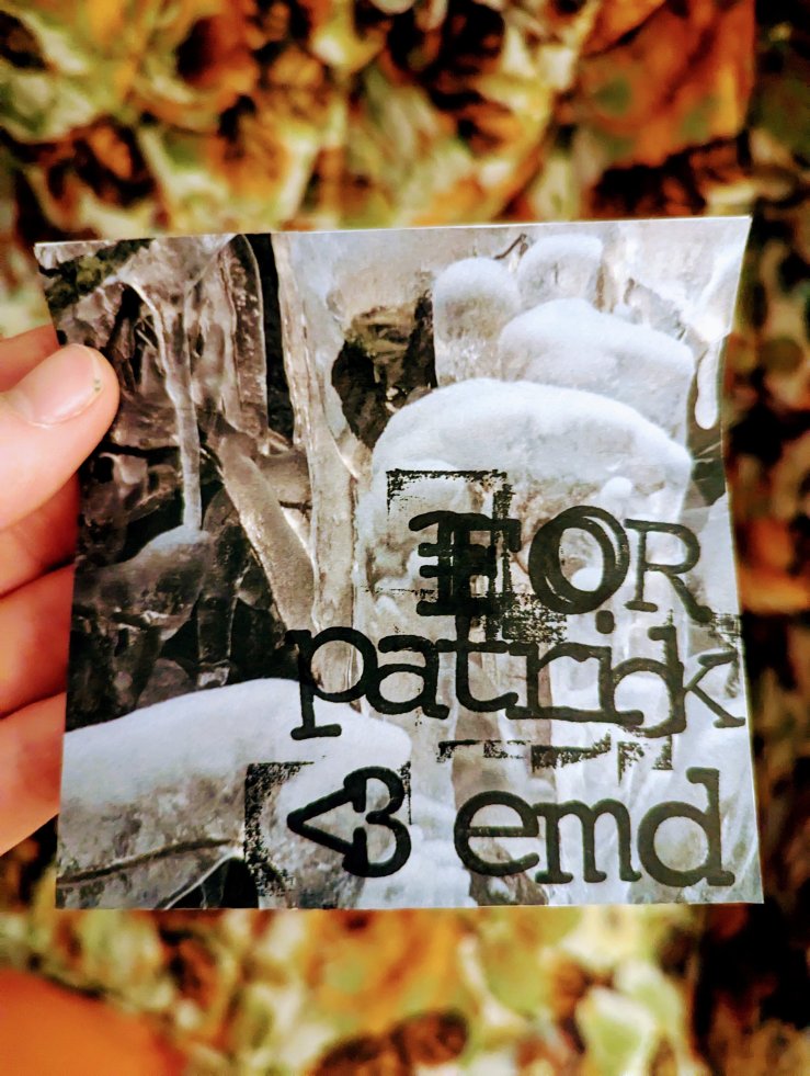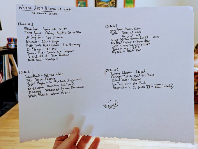 Side A is mostly songs opening up the space of my teenage years again, or songs celebrating teenage energy like “Teenage Nightingales to Wax” by Three Johns. There’s also a whole ass blizzard of memories and consciousness getting built up in the snow globe as the tape rolls. “Clap and Cough” by Discount was a favorite song between my first punk friend and I, located on one of the cheap $5 used comps we found at a record store somewhere near Westgate or Great Northern (malls in the west Cleveland suburbs) in late 2000, most likely. “The Getaway” by Pretty Girls Make Graves is when the snow really arrives…a song about running away from your past home life with someone you love, how you can go anywhere as long as you never go home, except now I’m listening to it as I do go home. The C-Clamp into Sonora Pine transition happened in my fall tape, too: the sense of both season and history conjured is just too good…both from the mid-to-late ’90s, but recently receiving very deserved reissues. “Snow Patterns” by Q and Not U suggests the quiet, secret planning in the background happening for the Black Eyes reunion, as well as the way all these magical things are happening and being put into motion through tapes and other transmissions….”secret messages in snow.” I don’t know if anyone has been noticing, but I put a different track from Mike Weis’ In Low Light: Music for the Winter Solstice on every winter mixtape I make. It’s the perfect winter music, so I’m going to keep giving it to you. Hopefully, in the future, when my life is not actively disintegrating, we can get it to you while it is still winter! That’s a very serious goal and has been for a while.