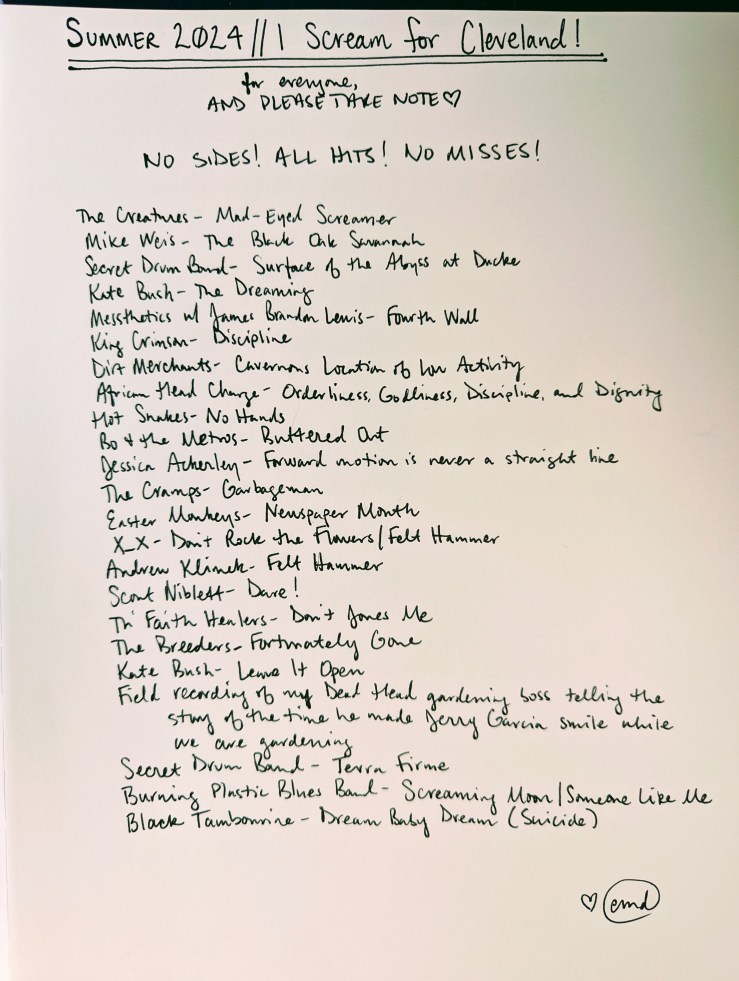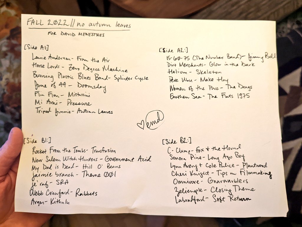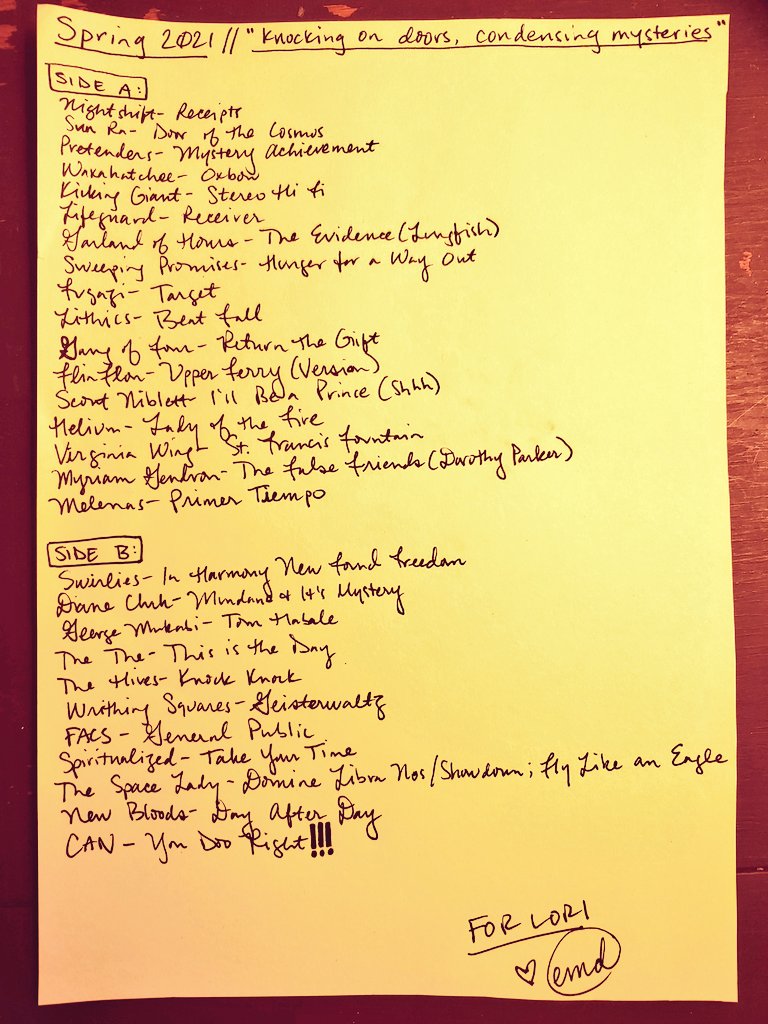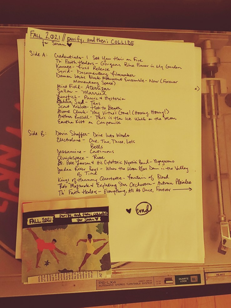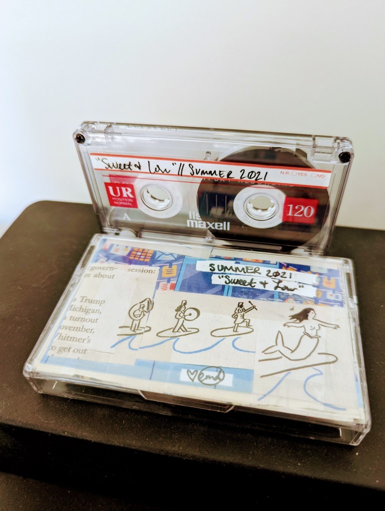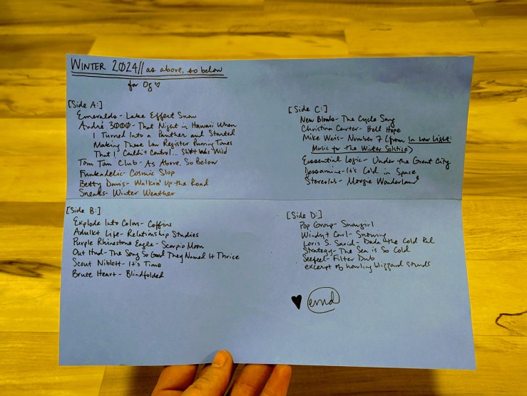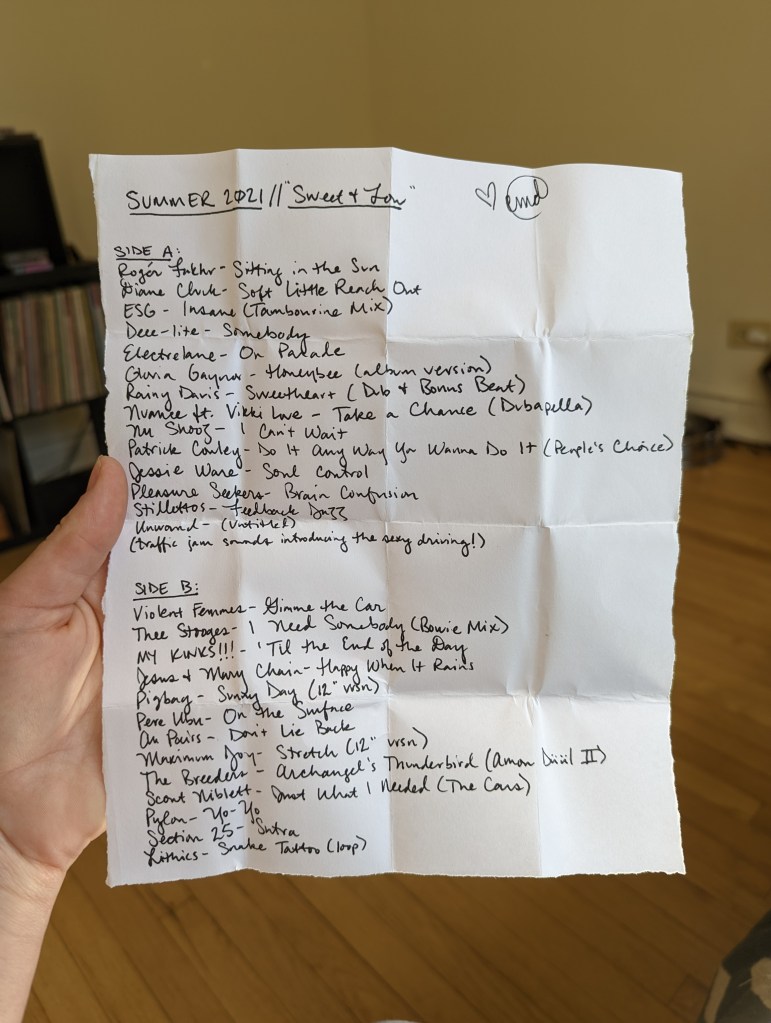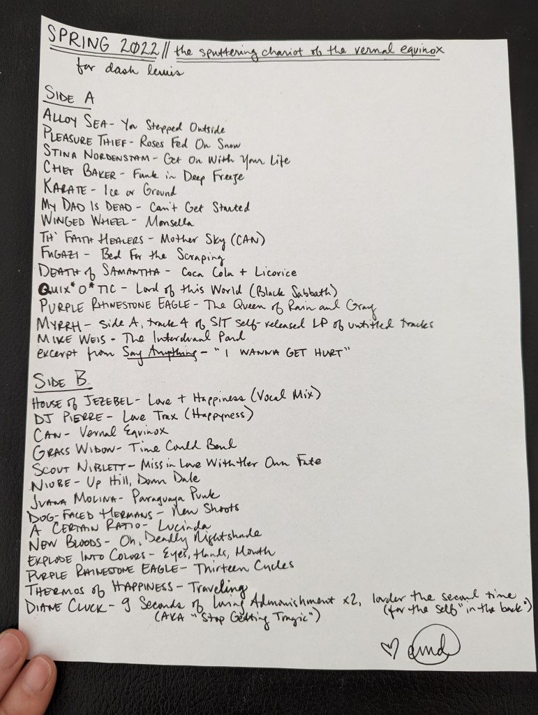 The last seasonal Spotify playlist I made, Spring 2020’s “feel like snakes twisting through quarantine,” is one I spent a lot of time on and remain very proud of, even though I cannot hear my own work anymore, since I refuse to pay Spotify to listen to playlists in order. You can hear and see that it was the light through the tunnel to making real mixtapes again; I even made a paper playlist for the sheer joy of writing out a playlist on a page with ink and making it beautiful, even though it just lives in the folder built into the planner I used for that year or whatever now. I just made it to remember how much I love doing that. And I’m glad I did: it led me not just back to making mixtapes, but to doing things that bring me joy again generally.
