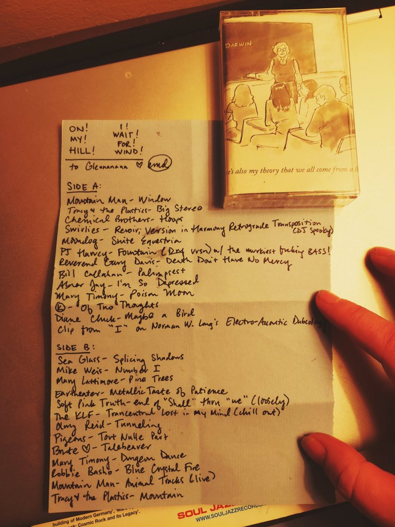 In the fall of that year, I did a mixtape trade with my friend Carrie, but I was missing one aspect of making sharable playlists through a streaming service: being able to keep listening to the mixes I made forever. Carrie’s tape ended up being kind of a study for the tape I eventually made for my old friend Glenna, the first in this series, which was digitized and shared with the world after Glenna received the hard copy. It actually played an important role in me getting my first assignment for Bandcamp, even. There has been a feeling of magic about the series since it began; these tapes seem to manifest the future in big ways. They are also a way for me to catalog my life and share it with others–not just the recipient I make the hard copy for, but anyone who wants to hear it online.