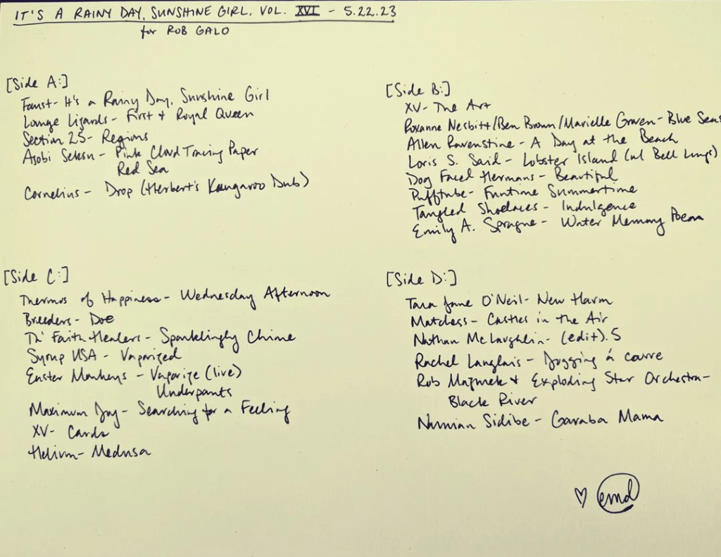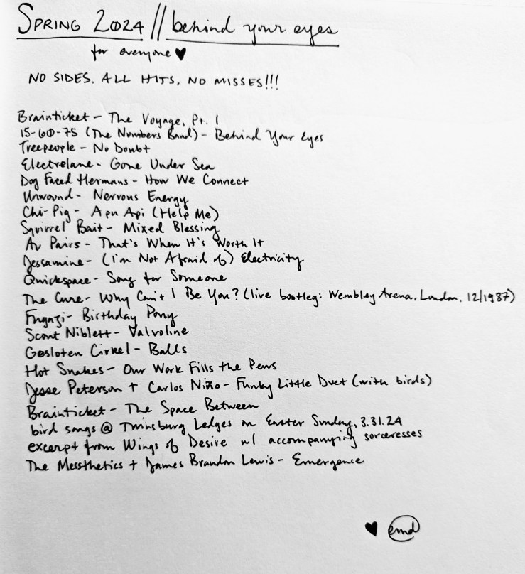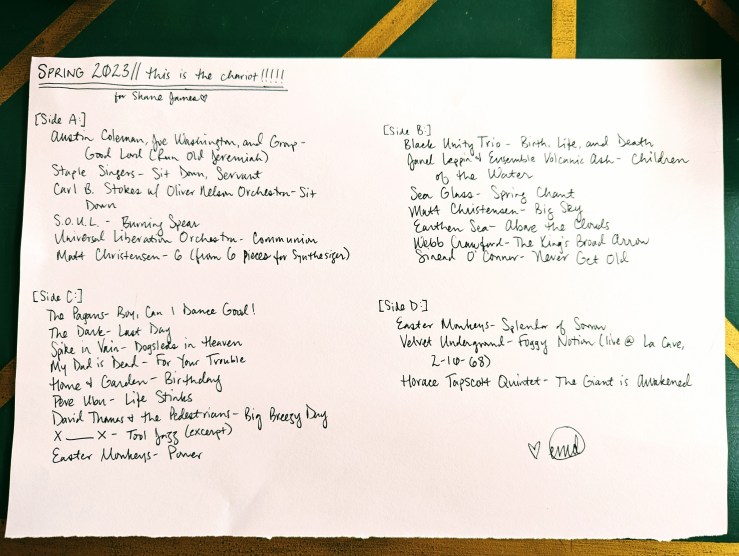 In my late teens and early twenties, I journaled so much that I would go through many journals a year, but at a certain point writing just to myself didn’t feel very interesting or valuable anymore–the moment perhaps when you cannot deny you are supposed to be a writer and do something about it. The period of isolated “figuring out” had run the length of its real utility. I wanted to have audiences for things I make, and I also find these mixtapes to be more useful little time capsules to remember my life by than whatever weird scribbles would result from each individual day…things that felt totally important in a given moment, but in the grand scheme of everything make little sense. Each tape is made very powerful by the amount of listening, thought, intention, and craft that go into them over many, many hours each season. I spend so much time on each one that I can always return very intensely to the time and space in which I was making that tape, what I was thinking, feeling, processing, considering, or envisioning.